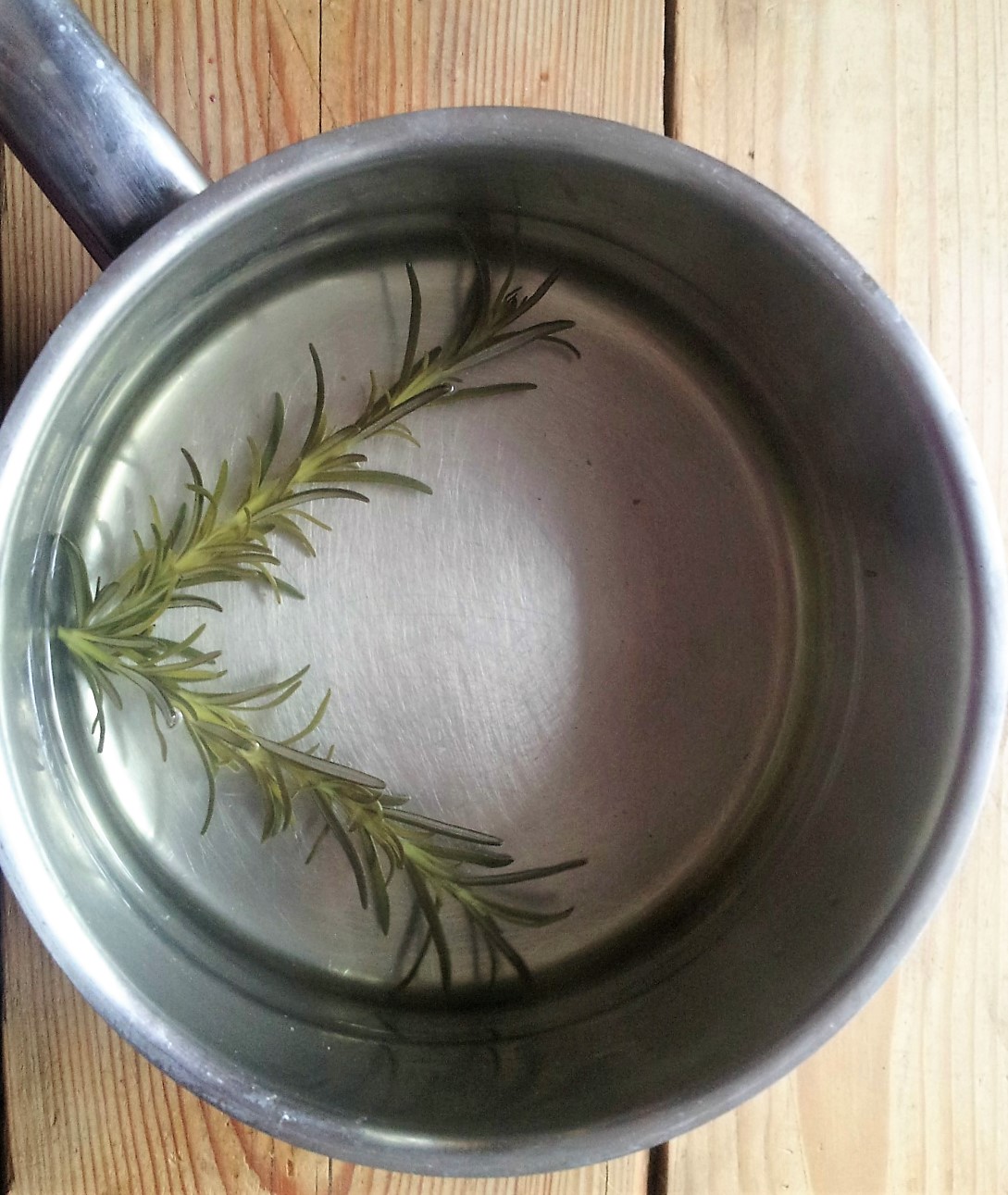 Bringe das Wasser zum Kochen und füge dann die Rosmarin Zweige hinzu. Drehe den Herd auf eine kleine Temperatur, so dass das Wasser noch leicht köchelt. Nach ca. 20 min gießt du den Rosmarin-Tee durch ein Sieb in ein Gefäß Deiner Wahl und lässt ihn dort abkühlen. In der Zwischenzeit kannst Du Dir schon mal die Haare waschen.